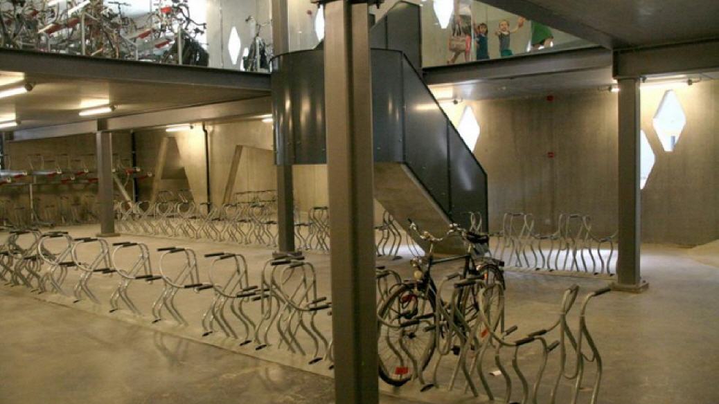 Der Fahrradparkplatz im Kunstzentrum Vooruit in Gent, Belgien, wurde mit unserem zweistöckigen Fahrradparksystem 2Parkup und unseren Fahrradständern Cobra ausgestattet.